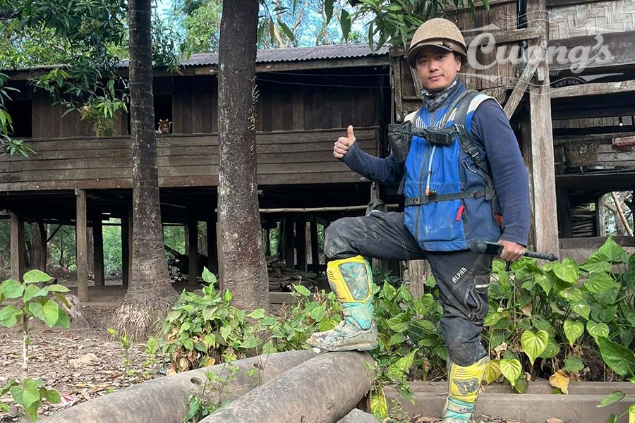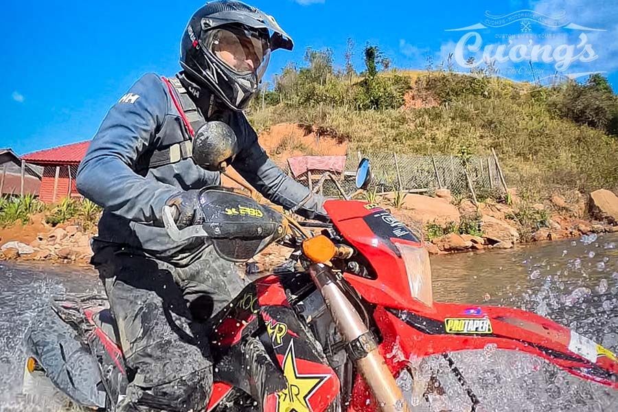 River crossings became a regular part of the day—sometimes shallow and playful, sometimes wide enough to make you pause, pick a line, and commit. Phu would walk the crossing when needed, pointing out the safest route like it’s no big deal, while Diep would be in the background grinning like he’d personally asked the river to spice things up for us.